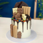 Is it possible to overdose on chocolate? There's only one way to find out, with our Chocolate Overload Cake - featuring vanilla buttercream and chocolate ganache drip, topped with a wild assortment of chocolate. Enough to give any nutritionist a dead set heart attack. (Please note chocolates may change due to availability.)