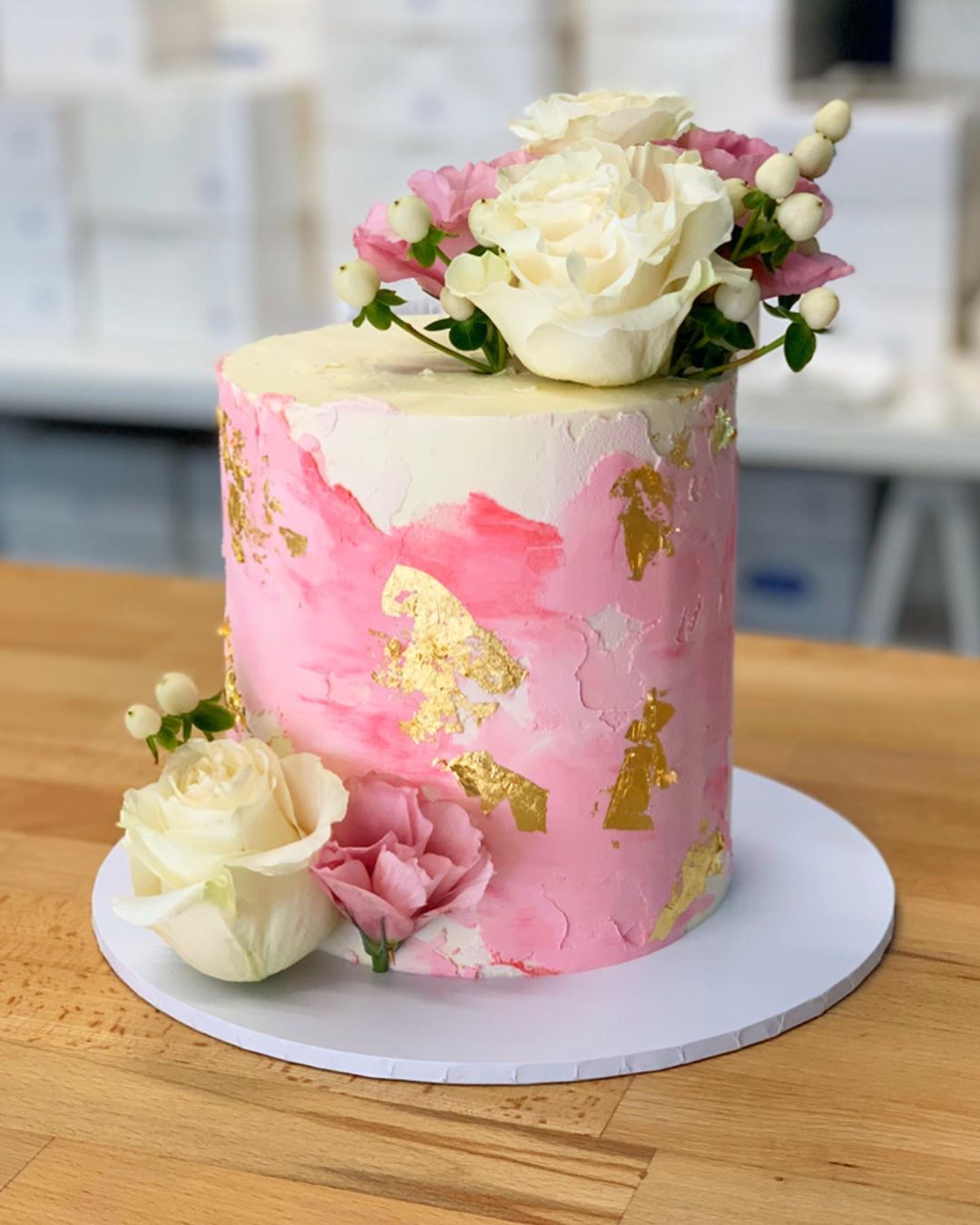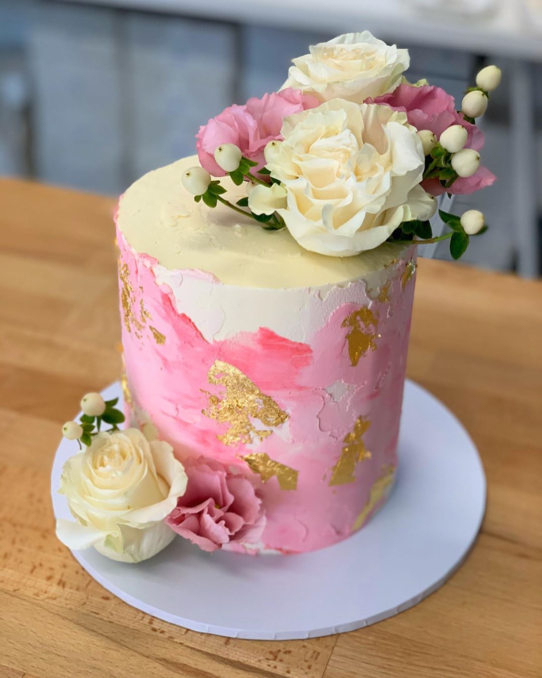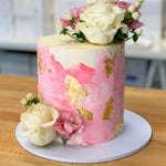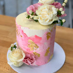 A Pink textured Buttercream with Fresh Florals & Gold Leaf.