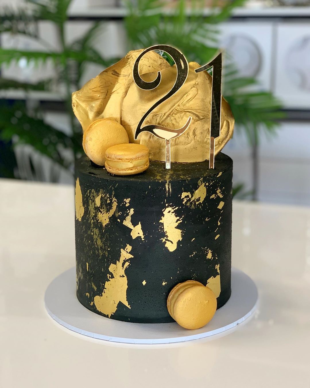 Smooth Chocolate Black Buttercream topped with Gold Painted White Chocolate Sails, Gold Leaf & x3 Gold Painted Vanilla Macarons.