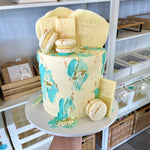 This stunning cake is smudged in shades of blue and finished with three vanilla macarons, delicate white chocolate sails, Milky Bar pieces, and striking white and gold accents. A sophisticated showstopper for any special occasion.