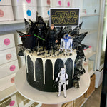 Topped with dramatic black chocolate shards, galaxy-style black buttercream, a smooth white chocolate ganache drip, and scattered sprinkles — this Star Wars-inspired cake is out of this world. Perfect for fans of the Force and sure to impress at any celebration.