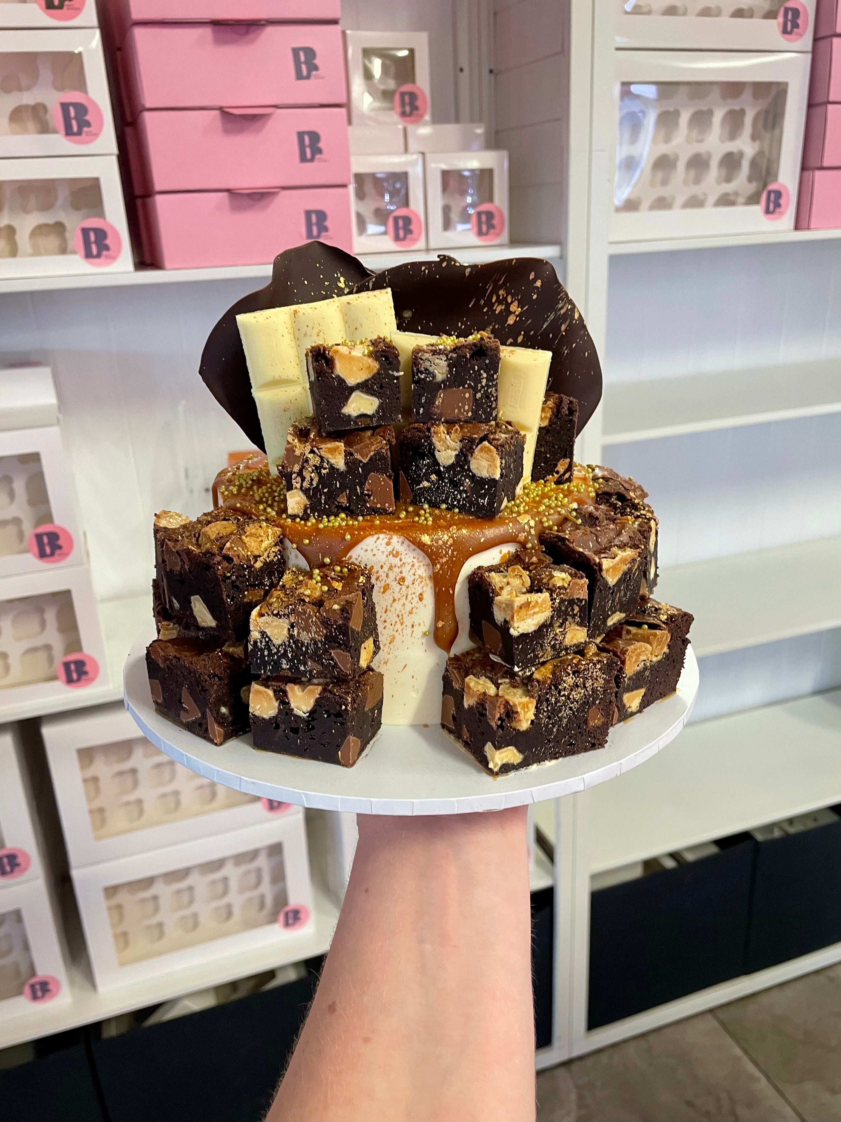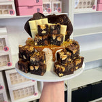 If you've fallen in love with our Triple Choc Brownies you'll fall in love with this cake. Stacked high with our famous Triple Choc Brownies over a Caramel Drip including Chocolate & gold features.
