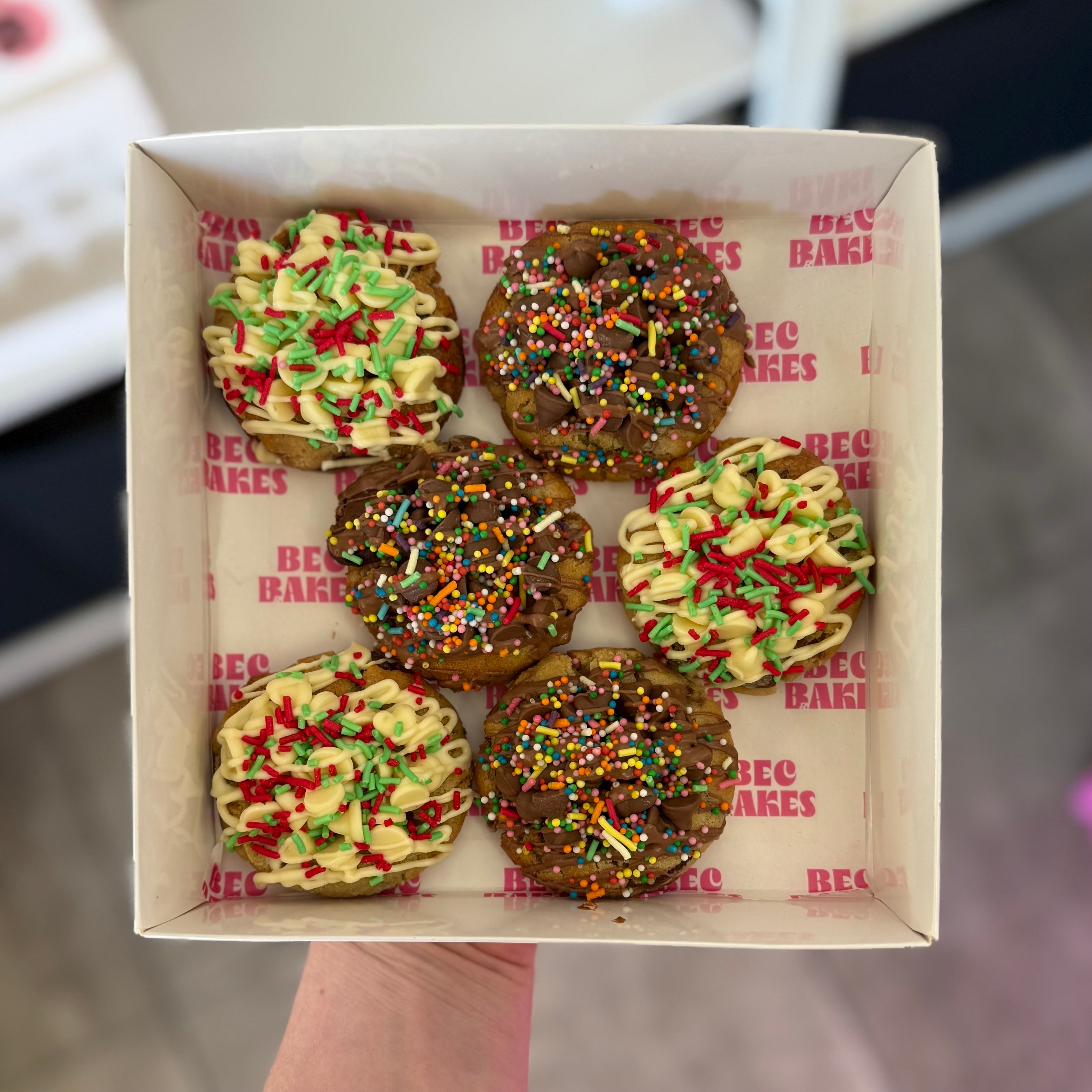 • 3 x White Choc Sprinkle Cookies drizzled in White Chocolate & Choc Chips