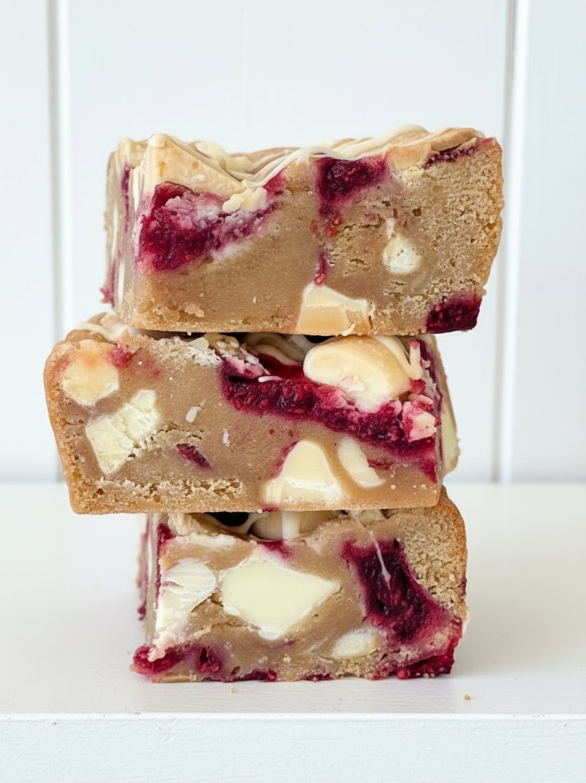 Our Raspberry & White Choc Blondie is the perfect balance of sweet and tart — stuffed with White Chocolate Chunks & Raspberries. Soft, golden, and utterly delicious.