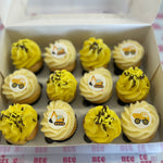 Included in this box is 12 x Medium Vanilla Cupcakes topped with Yellow & White Buttercream, Sprinkles & Edible Image Toppers.
