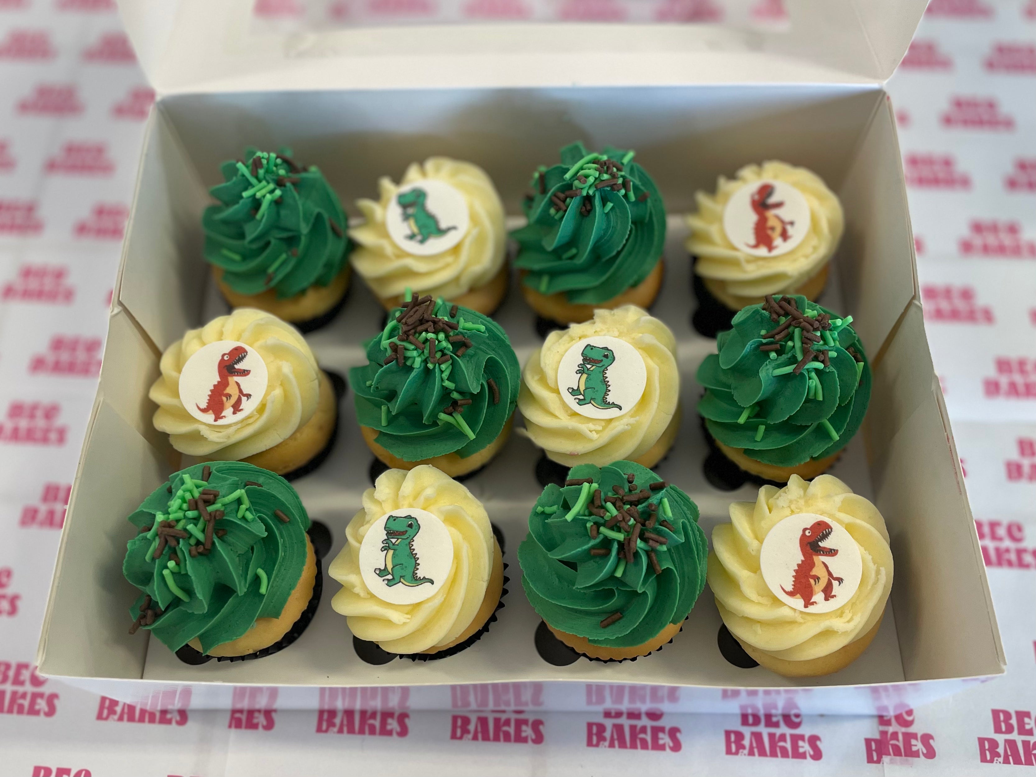 Celebrate in style with our Dinosaur cupcakes! Six cupcakes are topped with edible dinosaur images, while the others are decorated with matching buttercream. A roaringly fun and delicious mix for every dinosaur lover.