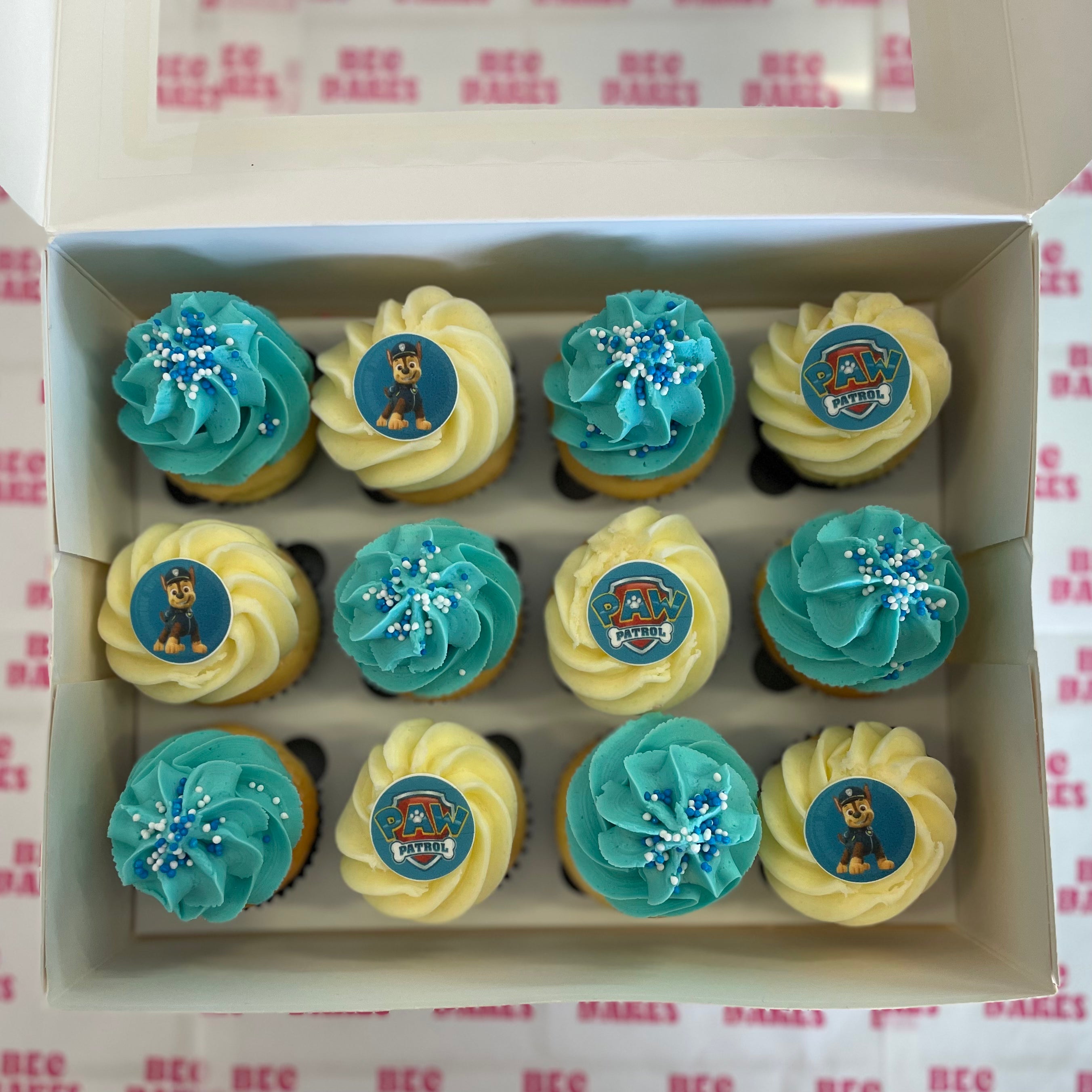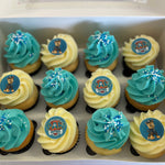 Included in this box is 12 x Medium Vanilla Cupcakes topped with Blue & White Buttercream, Sprinkles & Edible Image Toppers.