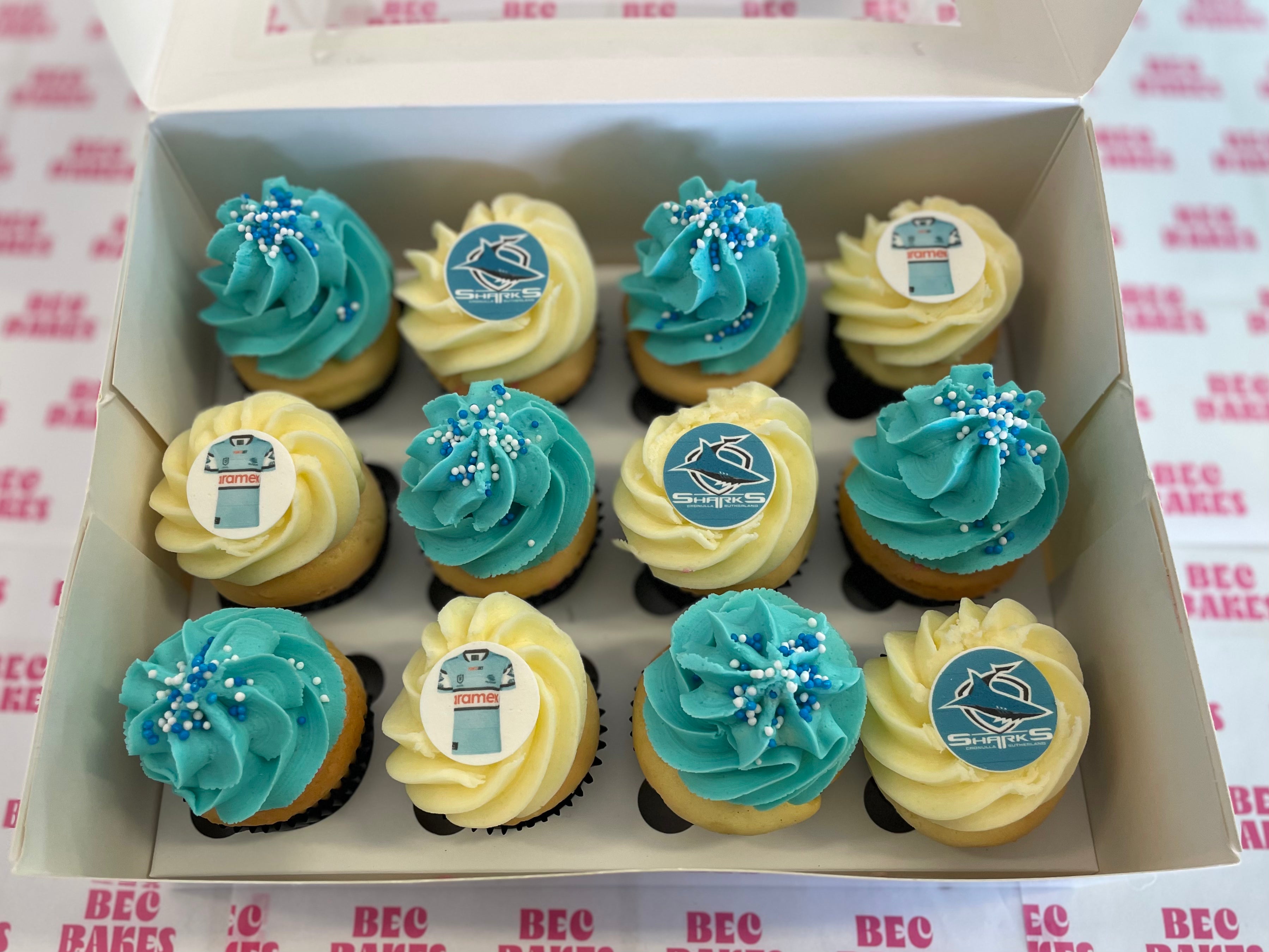 Celebrate in style with our Sharkies cupcakes! Six cupcakes are topped with edible Sharks images, while the others are decorated with matching buttercream. A winning and delicious mix for every Sharks supporter.