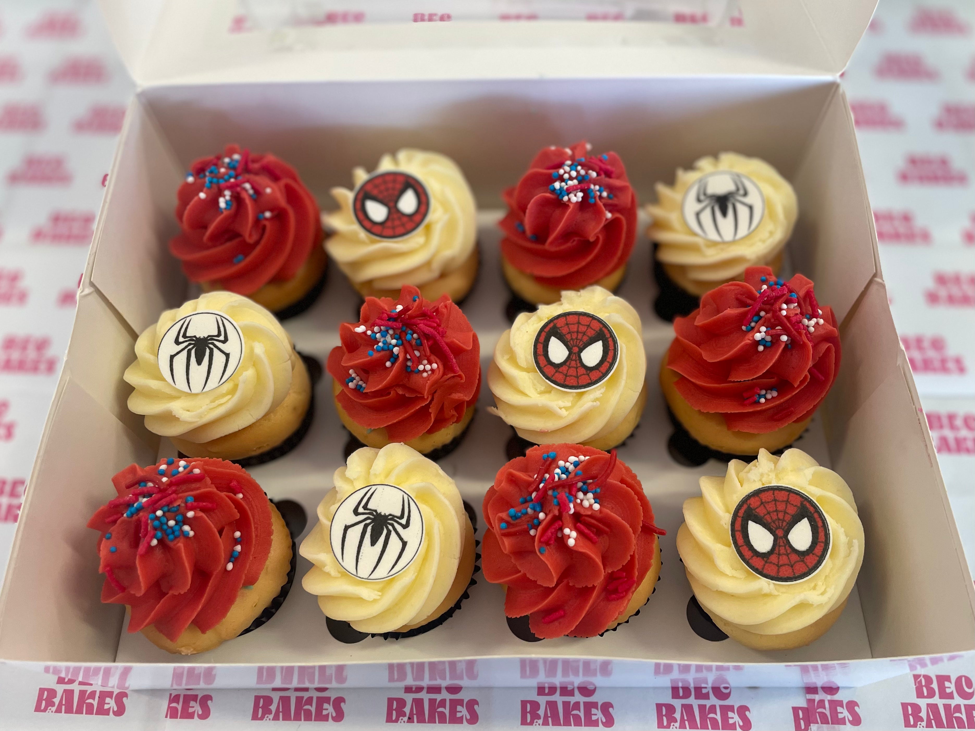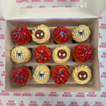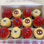 Celebrate in style with our Spiderman cupcakes! Six cupcakes are topped with edible Spiderman images, while the others are decorated with matching buttercream. A fun and delicious mix for every superhero fan.
