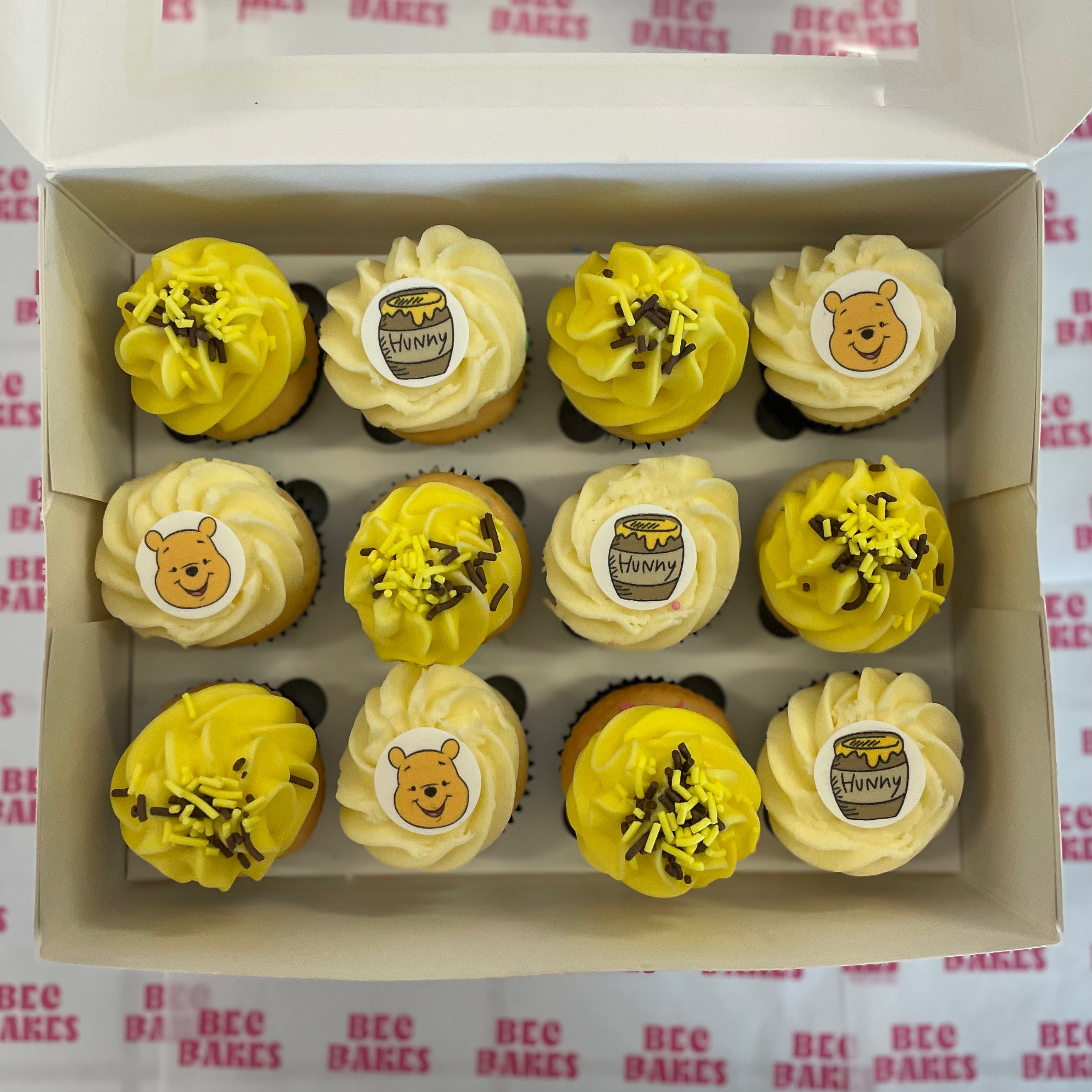 Celebrate in style with our Winnie the Pooh cupcakes! Six cupcakes are topped with edible Pooh images, while the others are decorated with matching buttercream. A sweet and delicious mix for every Pooh Bear fan.