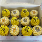 Included in this box is 12 x Medium Vanilla Cupcakes topped with Yellow & White Buttercream, Sprinkles & Edible Image Toppers.