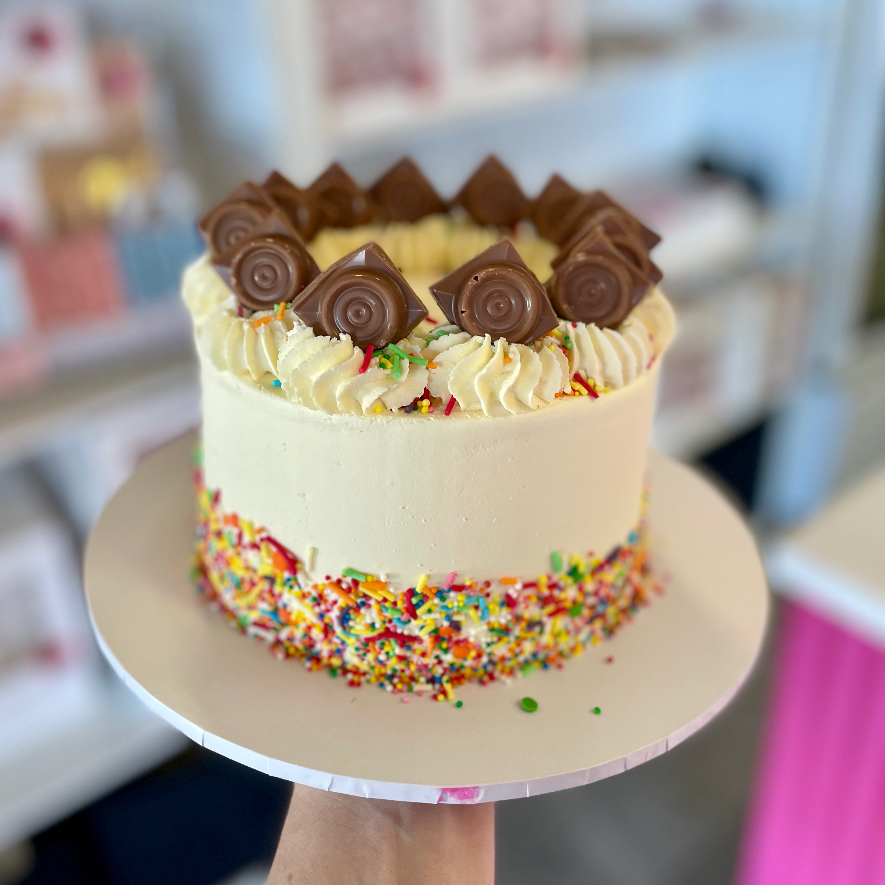 Our classic Vanilla sponge — finished with white icing and topped with Nestle Rolo pieces. Simple, fun, and seriously satisfying.