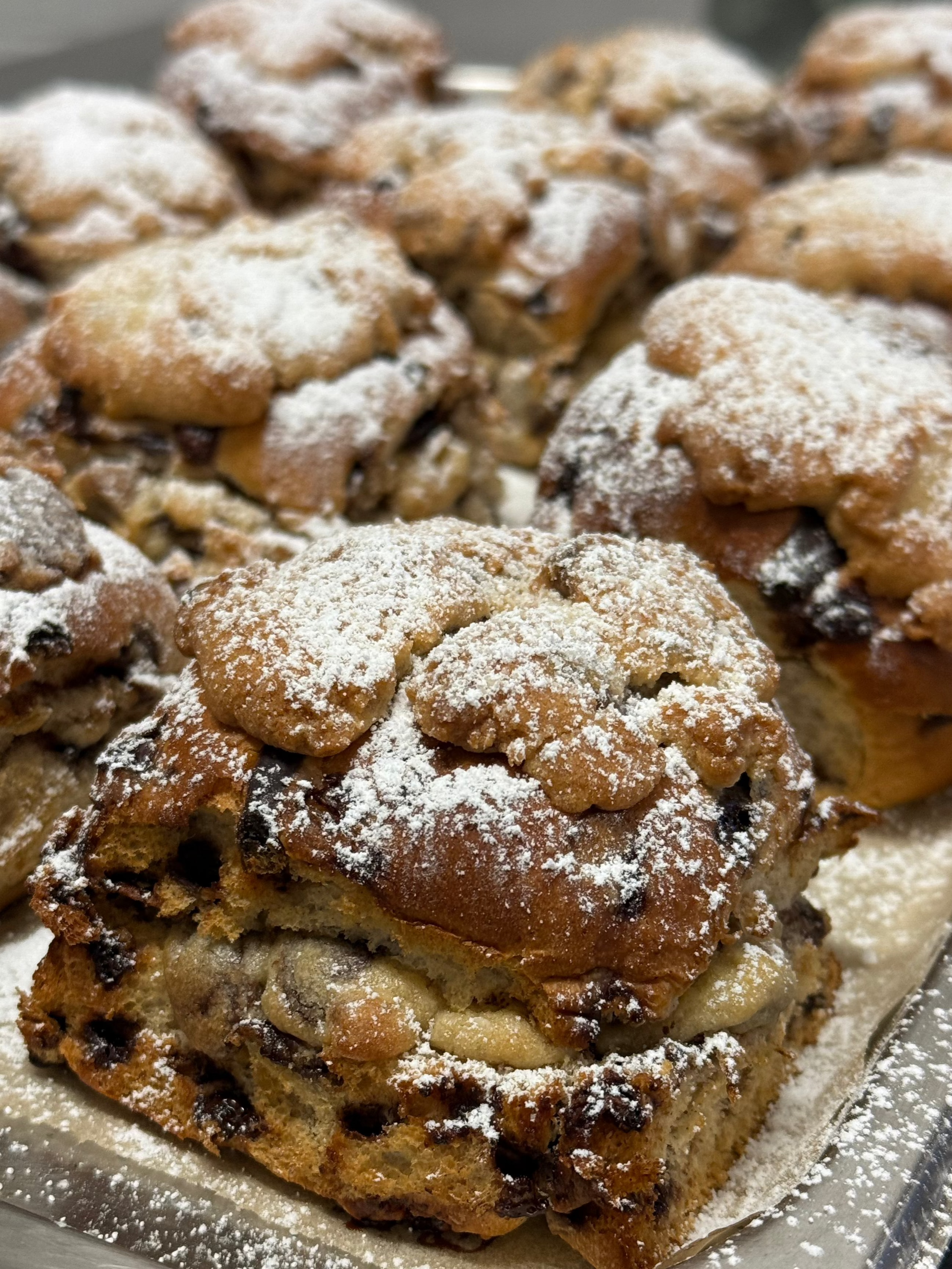 This box contains 4 x Chocolate Hot Cross Buns filled & topped with our OG Choc Chunk Cookie.