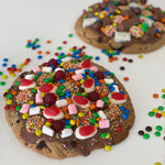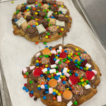 HELLO COOKIE PIZZA!! Our famous Choc Chunk Cookie covered with Cadbury Milk Chocolate & topped with Allen's Lollies, Mini Marshmellows, M&M's & Freckles!