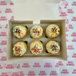 This box contains 6 Vanilla Cupcakes topped with Vanilla Buttercream & Sprinkles.